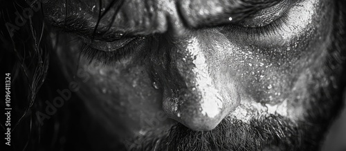 Intense close-up of a man weeping passionately with emotional expression and dramatic lighting in black and white