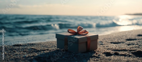 Gift box with ribbon on sandy beach during sunset with ocean waves in background creating a serene and inviting atmosphere.