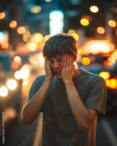 Emotional expression of young man amidst vibrant city night