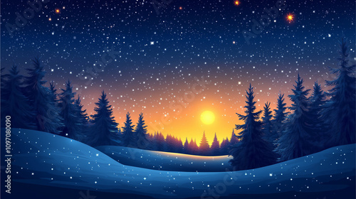 Winter Wonderland: A serene winter landscape, adorned with a majestic sunrise, as snow gently falls upon a snow-covered forest. The sun's rays illuminate the frosted pines.