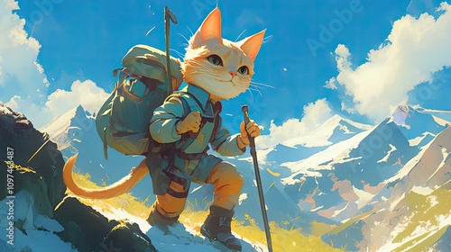 An Orange Cat Backpacker Hikes Up Snowy Mountains