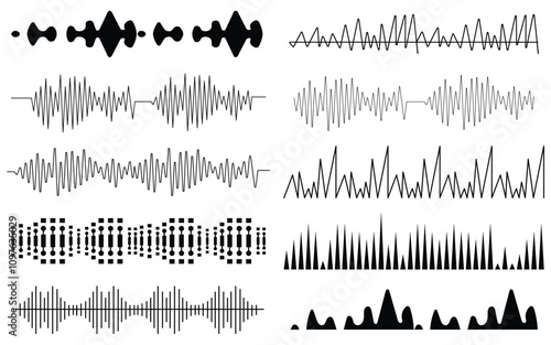 Set of sound waves, equalizer, music wave, digital and analog line waveforms. Audio sound symbol, radio signal frequency and digital voice visualisation wave. Radar signal, sonar sound recording icons