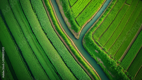 Malowniczy krajobraz rolniczy z bujnymi uprawami, regularnie nawadnianymi przez system irygacyjny biegnący wzdłuż pola.
