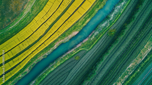 Malowniczy krajobraz rolniczy z bujnymi uprawami, regularnie nawadnianymi przez system irygacyjny biegnący wzdłuż pola.