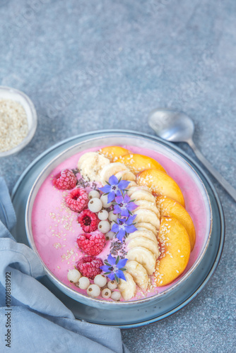 Bowl na śniadanie ze świeżymi i mrożonymi owocami.
