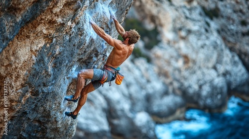 Rock climber scaling a sheer cliff face without ropes, intense focus and concentration, dramatic natural landscape in the background,