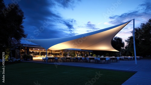 Illuminated tensile structure over patio.