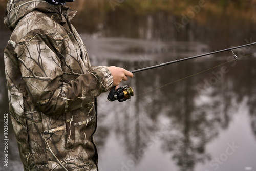 Wędkarz łowiący ryby trzymający w rękach wędkę z kołowrotkiem