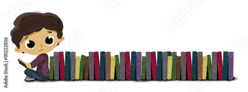 Niño leyendo o estudiando. Está junto a muchos libros. Aprender y disfrutar