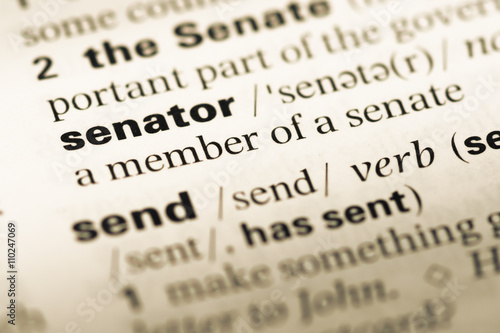 Close up of old English dictionary page with word senator