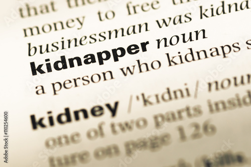 Close up of old English dictionary page with word kidnapper