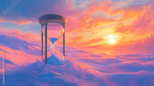 An hourglass rests on the glistening snow as the sun dips below the horizon, symbolizing the passage of time and the ephemeral nature of beauty. Ephemeral. Illustration