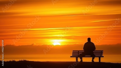 man is seated on a bench in a meadow, with a sunset illuminating the background.