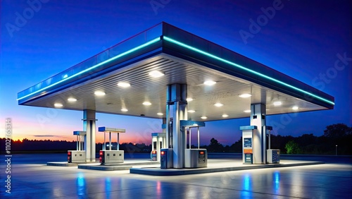 Petrol station with illuminated pumps for refueling vehicles on the go, refuel, gasoline, convenience, transportation, cars
