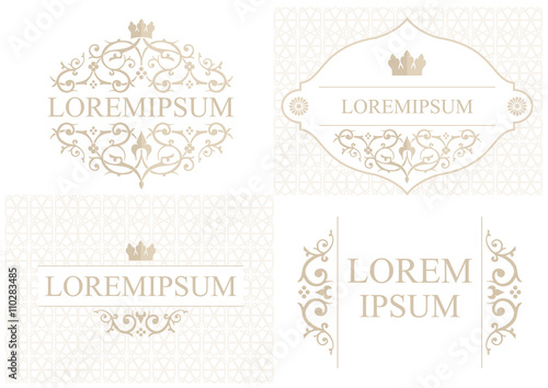 Set of the vignettes in the oriental style with vintage floral ornament and crown in beige tones
