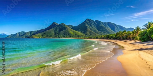 Tropical beach in North Queensland with mountains, blue waters, and clear sky , Port Douglas, Australia, beach