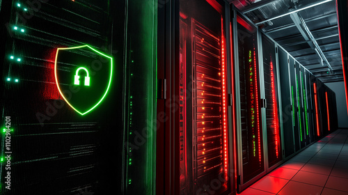 Data Security and Protection: A glowing green shield with a headset icon, a symbol of secure data and communication, stands out against a backdrop of server racks in a modern data center.