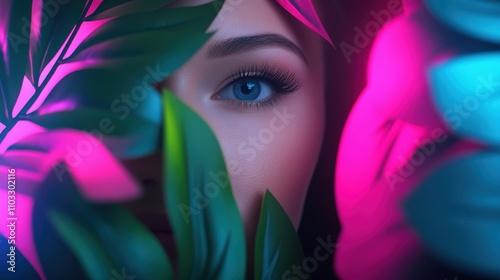 A close-up of a woman's eye partially concealed by lush green leaves, illuminated by soft pink and blue lighting, creating a serene yet intriguing ambiance, Ideal for beauty, nature