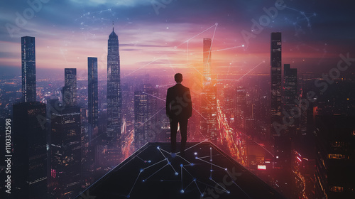 Abstract business man stands on the peak of success amid tall, innovative Smart city and graphs with statistics to analyze business potential and predict future developments in company growth.