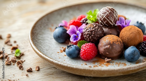 fotografia deserów gourmet, czekoladowe trufle, mieszane owoce jagodowe, jadalne kwiaty, luksusowy talerz deserowy, naturalne oświetlenie, delikatna porcelana, drewniany stół, miękkie rozproszone świa