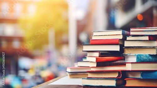 Several stacks of colorful books on a table and bookshelf with blurred library or bookstore background