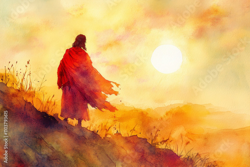 Jesus standing on a hilltop, his robe flowing in the wind, the sun setting behind him. The watercolor uses warm tones of red and gold to reflect divine love and eternal peace.