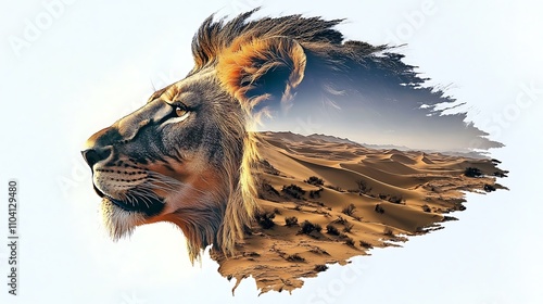 A vast desert shaped like a lion’s head, with golden dunes forming the contours of its face and swirling sand patterns defining its majestic mane, glowing under the soft light of sunrise,
