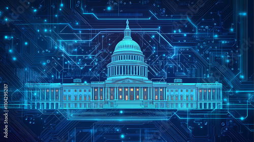 A stylized rendering of the us capitol building superimposed on a circuit board background. Transcendent. Illustration