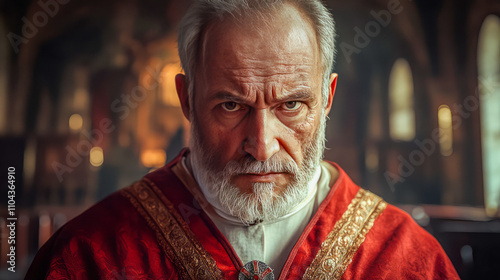 Elderly caucasian male priest in red vestment inside a dimly lit church interior