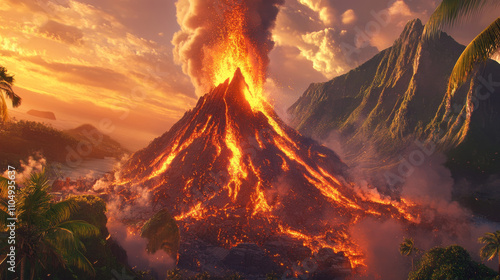 Volcano lava eruption. Vulcano mountain with smoke and fire. Active volcanic island illustration with evolution effect for catastrophe animation. Danger phenomenon sprite sheet element drawing set