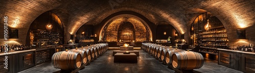 An underground wine cellar with rows of large wooden barrels stacked in neat rows, surrounded by stone walls and lit by warm, moody lighting