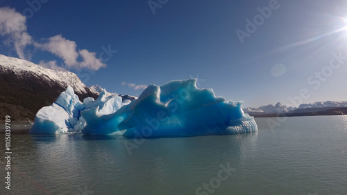 Imagen tomada en el Calafate, Argentina en la que se aprecia lago, montañas y nevados.