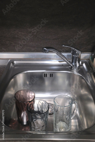 Glasses in Kitchen Sink Stainless Steel and Faucet. Kitchen Sink with Dirty Dishes, Dirty Glass in Sink, Washing Dishes