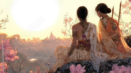 Sunset serenity two friends embracing nature's beauty in a tranquil landscape