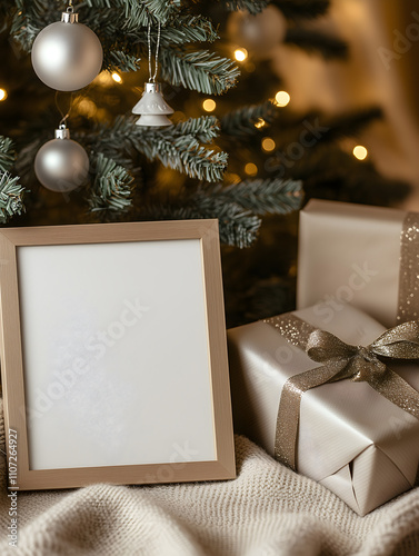 A beautiful Christmas scene with a decorated tree featuring silver ornaments, a blank photo frame for personal messages, and neatly wrapped gifts with a gold ribbon. Cozy, festive holiday atmosphere.