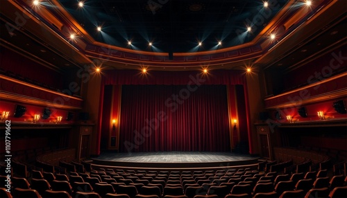 A classic theater stage with red velvet curtains and bright spotlights, ready for a grand performance