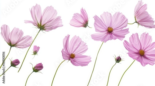a bunch of pink cosmos flowers on a white background The flowers are in full bloom, with some buds still in the process of blooming The petals of the flowers are