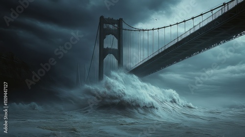 A towering suspension bridge over a stormy sea, waves crashing against the massive pillars below