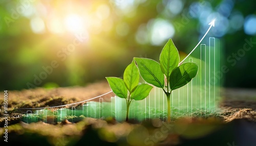 A vibrant green plant grows from soil, symbolizing growth and prosperity, with a rising graph overlay suggesting financial or ecological improvement.