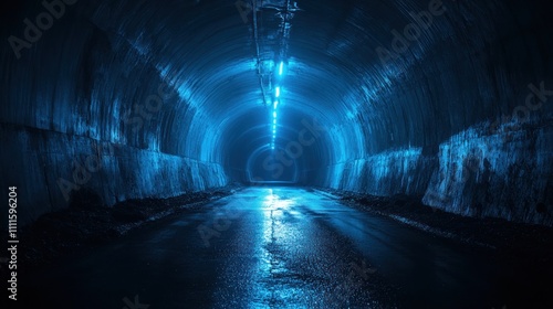 Dark tunnel illuminated by blue lights