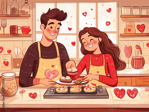 Walentynki - Wesoła, zakochana para piekąca wspólnie walentynkowe smakołyki w przytulnej kuchni