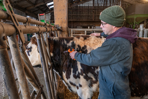 Campagne de vaccination contre la FCO (fièvre catarrhale bovine). Eleveur en train de vacciner une vache normande avec le vaccin de la marque Bluevac (bovins). Pistolet de vaccination