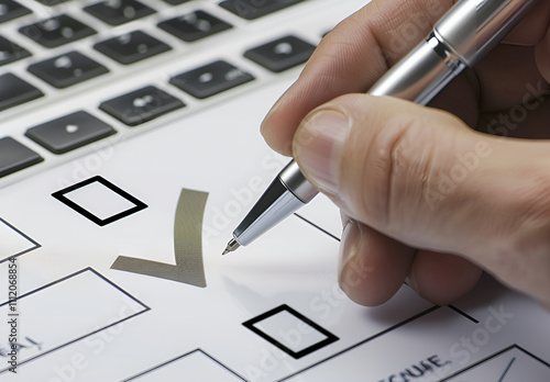 Zbliżenie na rękę wypełniającą formularz lub ankietę, zaznaczającą pole wyboru długopisem.
