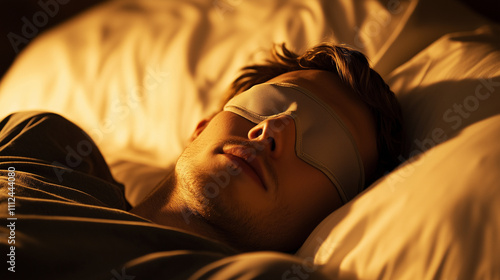 Śpiący mężczyzna z maską na oczy odpoczywa w ciszy, otoczony atmosferą nocnego spokoju.