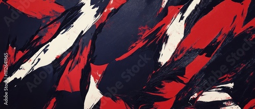 Abstract artwork featuring bold red, white, and black brushstrokes.