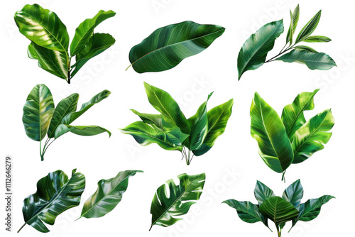 Collection of Green Tropical Leaves Isolated on Transparent or White Background