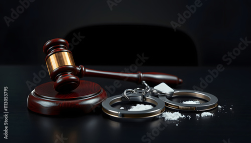 Judge gavel, handcuffs with white powder bag on dark table. Crime, robbery, drug trafficking concept isolated with white highlights, png