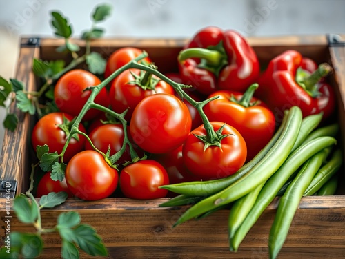 A colorful medley of cherry tomatoes, red bell peppers, and green beans in a pine box, meal prep inspiration, produce display, kitchen decor