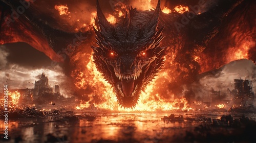 A dragon with red eyes and a fiery mouth is shown in a fiery landscape