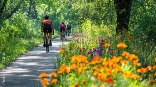 On a sunny day, cyclists ride along the Katy Trail, with vibrant wildflowers lining the path. The lush greenery creates a picturesque outdoor atmosphere.